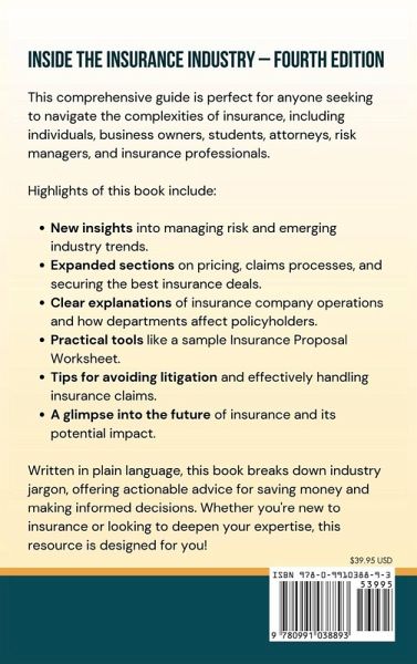 This comprehensive guide is perfect for anyone seeking to navigate the complexities of insurance, including individuals, business owners, students, attorneys, risk managers and insurance professionals. Highlights of this book include: New insights into managing risk and emerging industry trends. Expanded sections on pricing, claims processes, and securing the best insurance deals. Clear explanations of insurance company operations and how departments affect policyholders. Practical tools like a sample Insurance Proposal Worksheet. Tips for avoiding litigation and effectively handling insurance claims. A glimpse into the future of insurance and its potential impact. During a professional career as an insurance consultant spanning over 20 years, the author's primary focus during each project was to both enhance insurance coverage and save money for clients. This approach has been carried over into the contents of Inside the Insurance Industry - Fourth Edition, where readers can equally improve their insurance knowledge and save much more money than was invested to buy this book. Written in plain language, this book breaks down industry jargon, offering actionable advice for saving money and making informed decisions. Whether you are new to insurance or looking to deepen your expertise, this resource is designed for you!