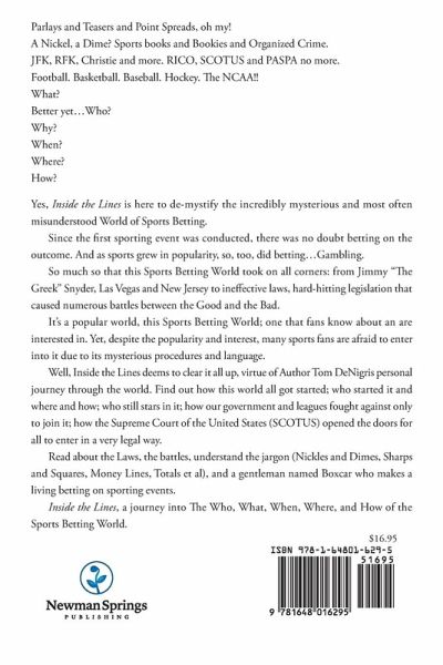 Parlays and Teasers and Point Spreads, oh my! A Nickel, a Dime? Sports books and Bookies and Organized Crime. JFK, RFK, Christie and more. RICO, SCOTUS and PASPA no more. Football. Basketball. Baseball. Hockey. The NCAA!! What? Better yet...Who? Why? When? Where? How? Yes, Inside the Lines is here to de-mystify the incredibly mysterious and most often misunderstood World of Sports Betting. Since the first sporting event was conducted, there was no doubt betting on the outcome. And as sports grew in popularity, so, too, did betting...Gambling. So much so that this Sports Betting World took on all corners: from Jimmy "The Greek" Snyder, Las Vegas and New Jersey to ineffective laws, hard-hitting legislation that caused numerous battles between the Good and the Bad. It's a popular world, this Sports Betting World; one that fans know about an are interested in. Yet, despite the popularity and interest, many sports fans are afraid to enter into it due to its mysterious procedures and language. Well, Inside the Lines deems to clear it all up, virtue of Author Tom DeNigris personal journey through the world. Find out how this world all got started; who started it and where and how; who still stars in it; how our government and leagues fought against only to join it; how the Supreme Court of the United States (SCOTUS) opened the doors for all to enter in a very legal way. Read about the Laws, the battles, understand the jargon (Nickles and Dimes, Sharps and Squares, Money Lines, Totals et al), and a gentleman named Boxcar who makes a living betting on sporting events. Inside the Lines, a journey into The Who, What, When, Where, and How of the Sports Betting World.