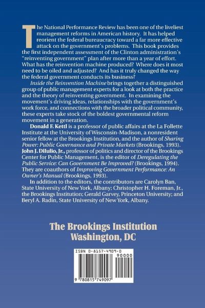 " This book provides the first independent assessment of the Clinton administration's ""reinventing government"" plan after a year of effort. What has the reinvention machine produced? Where does it most need to be oiled and adjusted? And has it truly changed the way the federal government conducts its business? The authors of Improving Government Performance: An Owner's Manual (Brookings, 1993) join with other public management experts for a look at both the practice and theory of reinventing government. In examining the movement's driving ideas, relationships with the government's workforce, and connections with the broader political community, they take stock of the boldest governmental reform movement in a generation. The authors assert that Vice President Gore's National Performance Review has sparked remarkable innovations by operating managers in federal agencies. The NPR, however, has unleashed broad changes throughout the federal government without building the new capacity in the Executive Office of the President required to manage the changing burdens of federal programs. The book appraises the many positive management reforms that federal managers have created, assesses the central political and administrative support that the White House must provide if the NPR is to be successful in the long run, and examines the lessons about the president's role in governmental management that the NPR's experiment in decentralized administration teaches. The contributors are Carolyn Ban, State University of New York (SUNY), Albany; Christopher H. Foreman, Jr., Brookings; Gerald Garvey, Princeton; Constance Horner, Brookings; and Beryl Radin, SUNY, Albany. Donald F. Kettl, professor and associate director at the LaFollette Institute of Public Affairs, University of Wisconsin-Madison, is the author of Sharing Power: Public Governance and Private Markets (Brookings, 1993) and coauthor of Civil Service Reform: Building a Government That Works (Brook"