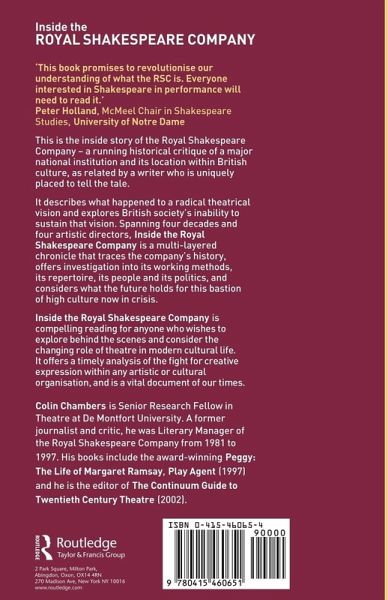 Colin Chambers is Senior Research Fellow in Theatre at De Montfort University. A former journalist and critic, he was Literary Manager of the Royal Shakespeare Company from 1981 to 1997. His books include the award-winning Peggy: The Life of Margaret Ramsay, Play Agent(1997) and he is the editor of The Continuum Guide to Twentieth Century Theatre (2002).