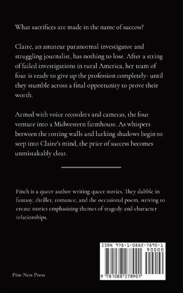 What sacrifices are made in the name of success? Claire, an amateur paranormal investigator and struggling journalist, has nothing to lose. After a string of failed investigations in rural America, her team of four is ready to give up the profession completely- until they stumble across a final opportunity to prove their worth. Armed with voice recorders and cameras, the four venture into a Midwestern farmhouse. As whispers between the rotting walls and lurking shadows begin to seep into Claire's mind, the price of success becomes unmistakably clear.