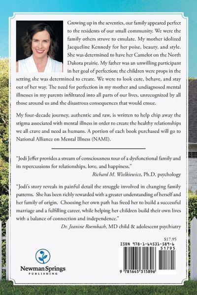 Growing up in the seventies, our family appeared perfect to the residents of our small community. We were the family others strove to emulate. My mother idolized Jacqueline Kennedy for her poise, beauty, and style. She was determined to have her Camelot on the North Dakota prairie. My father was an unwilling participant in her goal of perfection; the children were props in the setting she was determined to create. We were to look cute, behave, and stay out of her way. The need for perfection in my mother and undiagnosed mental illnesses in my parents infiltrated into all parts of our lives, unrecognized by all those around us and the disastrous consequences that would ensue. My four-decade journey, authentic and raw, is written to help chip away the stigma associated with mental illness in order to create the healthy relationships we all crave and need as humans. A portion of each book purchased will go to National Alliance on Mental Illness (NAMI).