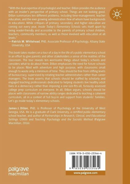 This book takes readers on a tour of a day in the life of a public elementary school in an effort to give parents and other stakeholders a sense of the realities of the classroom. The tour reveals ten worrisome things about today's schools and considers what to do about them. Dillon emphasizes the need for future schools to be places filled with adventure and high purpose, with classrooms small enough to waste only a minimum of time. They should be free from stifling levels of bureaucracy, supervised by rotating teacher administrators rather than career managers. The book asserts that schools should be staffed by scholarly and engaged teaching professionals dedicated to helping students live a healthy adult life in a democracy rather than imposing a one-size-fits-all, furiously assessed college prep curriculum on everyone. In all, Dillon argues, schools should be places with classrooms of narrow ability ranges dedicated to teaching a coherent curriculum, all in a context of full buy-in and support from students' families. Let's go inside today's elementary schools.