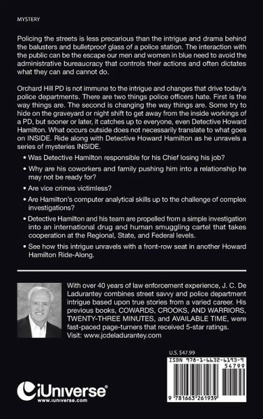 Policing the streets is less precarious than the intrigue and drama behind the balusters and bulletproof glass of a police station. The interaction with the public can be the escape our men and women in blue need to avoid the administrative bureaucracy that controls their actions and often dictates what they can and cannot do. Orchard Hill PD is not immune to the intrigue and changes that drive today's police departments. There are two things police officers hate. First is the way things are. The second is changing the way things are. Some try to hide on the graveyard or night shift to get away from the inside workings of a PD, but sooner or later, it catches up to everyone, even Detective Howard Hamilton. What occurs outside does not necessarily translate to what goes on INSIDE. Ride along with Detective Howard Hamilton as he unravels a series of mysteries INSIDE. ¿ Was Detective Hamilton responsible for his Chief losing his job? ¿ Why are his coworkers and family pushing him into a relationship he may not be ready for? ¿ Are vice crimes victimless? ¿ Are Hamilton's computer analytical skills up to the challenge of complex investigations? ¿ Detective Hamilton and his team are propelled from a simple investigation into an international drug and human smuggling cartel that takes cooperation at the Regional, State, and Federal levels. ¿ See how this intrigue unravels with a front-row seat in another Howard Hamilton Ride-Along.