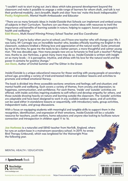 Introduction * What is emotional literacy? * Why emotional literacy? * Why outside? * How to use this book Section 1 - Feelings and emotions * What are feelings? * Sonic sit-space * Regulating emotions * Counting birds * Self-care and coping * Design-a-duck * What do we need? * Natural colours * Fear and phobias * Counting bugs * Anger * Sensory sit-spot * Happiness * Gratitude scavenger hunt Section 2 - Self and situation * Self-awareness * Texture bingo * Identity * Sense of place - street-work * Conflict * Our habitats * Communication * Mindfulness in nature - bird sounds * SWOT * Signs of sustainability * Respect * Counting wildflowers * Friendships * Bling up a butterfly Section 3 - Mental health and wellbeing * Mental health * Have-a-go-at-Haiku * Poor mental health * The A-Z of noticing nature * Depression * Nest building * Anxiety * Nature mandalas * OCD * Fashion a feather * Stress * Regulation - outdoors * An active mind * Nature calm jars Appendices