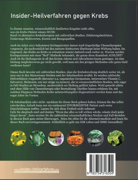 In diesem smarten, wissenschaftlich fundierten Ratgeber steht alles, was ein Krebs-Patient wissen MUSS:Rund 70 alternative Krebstherapien mit zahlreichen Studien, Erfahrungsberichten, Dosierungs-Richtwerten, Kosten und Bezugsquellen.Auch im Jahre 2021 bekommen Krebspatienten immer noch fragwürdige Chemotherapien vorgesetzt, die nachweislich bei den meisten Krebsarten überhaupt keine Wirkung haben. Im Gegenteil, das Risiko an Krebs zu erkranken nimmt dadurch noch weiter zu. Warum werden Krebspatienten mit einer "Heil"-Methode behandelt, die genau diese Krankheit AUSLÖST? Auch ist die Heilungsrate in all den letzten Jahren und Jahrzehnten kaum gestiegen. Ist eine Heilung möglicherweise gar nicht gewollt, weil man mit den jetzigen Methoden sehr gutes Geld verdienen kann?Dieses Buch beweist mit zahlreichen Studien, dass die Krebsforschung deutlich weiter ist, als man uns in den Mainstream-Medien und der Schulmedizin erzählt. Es werden zahlreiche Heilverfahren vorgestellt (darunter u.a. organisches Germanium, intravenöses Vitamin C, Salvestrol, Melatonin, um nur einige zu nennen), die in wissenschaftlichen Studien, teils sogar in Fall-Studien an Menschen, nachweislich zur Heilung geführt haben. Wohl gemerkt allein und ohne Hilfe von Chemotherapie oder Bestrahlung! Darüber hinaus erfahren Sie, mit welchen Diagnose-Methoden Krebs nebenwirkungsfrei diagnostiziert werden kann und das sogar Jahre im Voraus. Ob Schulmedizin oder nicht- nachdem Sie dieses Buch gelesen haben, können Sie das selbst entscheiden. Jedoch kann nur ein umfassend INFORMIERTER Patient auch weise Entscheidungen treffen. Lassen Sie sich diese Freiheit nicht nehmen!Falls Sie skeptisch sind und denken "Wenn das alles so toll wirken würde, wüsste doch jeder längst davon", dann werden Sie die zahlreichen wissenschaftlichen Studien und Fall-Berichte in diesem Buch ganz sicher überzeugen. Seien Sie offen für die Alternativmedizin und lesen Sie dieses Buch unvoreingenommen. Schließlich es geht um IHRLeben und IHRE Gesundheit!