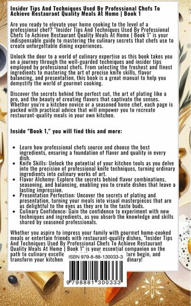 Insider Tips And Techniques Used By Professional Chefs To Achieve Restaurant Quality Meals At Home Book 1 - Learn How To Create Tantalizing And Savory Meals That Are Bound To Impress . Are you ready to elevate your home cooking to the level of a professional chef? "Insider Tips And Techniques Used By Professional Chefs To Achieve Restaurant Quality Meals At Home Book 1" is your indispensable guide to mastering the culinary secrets that chefs use to create unforgettable dining experiences. Unlock the door to a world of culinary expertise as this book takes you on a journey through the well-guarded techniques and insider tips employed by professional chefs. From selecting the freshest and finest ingredients to mastering the art of precise knife skills, flavor balancing, and presentation, this book is a great manual to help you demystify the world of gourmet cooking. Discover the secrets behind the perfect cut, the art of plating like a pro, and the beauty of creating flavors that captivate the senses. Whether you're a kitchen novice or a seasoned home chef, each page is packed with practical advice that will empower you to recreate restaurant-quality meals in your own kitchen. Inside "Book 1," you will find this and more: - Learn how professional chefs source and choose the best ingredients, ensuring a foundation of flavor and quality in every dish. - Knife Skills: Unlock the potential of your kitchen tools as you delve into the precision of professional knife techniques, turning ordinary ingredients into culinary works of art. - Flavor Alchemy: Explore the secrets behind flavor combinations, seasoning, and balancing, enabling you to create dishes that leave a lasting impression. - Presentation Perfection: Uncover the secrets of plating and presentation, turning your meals into visual masterpieces that are as delightful to the eyes as they are to the taste buds. - Culinary Confidence: Gain the confidence to experiment with new techniques and ingredients,