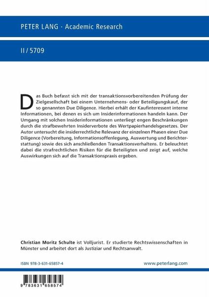 Das Buch befasst sich mit der transaktionsvorbereitenden Prüfung der Zielgesellschaft bei einem Unternehmens- oder Beteiligungskauf, der so genannten Due Diligence. Hierbei erhält der Kaufinteressent interne Informationen, bei denen es sich um Insiderinformationen handeln kann. Der Umgang mit solchen Insiderinformationen unterliegt engen Beschränkungen durch die strafbewehrten Insiderverbote des Wertpapierhandelsgesetzes. Der Autor untersucht die insiderrechtliche Relevanz der einzelnen Phasen einer Due Diligence (Vorbereitung, Informationsoffenlegung, Auswertung und Berichterstattung) sowie des sich anschließenden Transaktionsverhaltens. Er beleuchtet dabei die strafrechtlichen Risiken für die Beteiligten und zeigt auf, welche Auswirkungen sich auf die Transaktionspraxis ergeben.