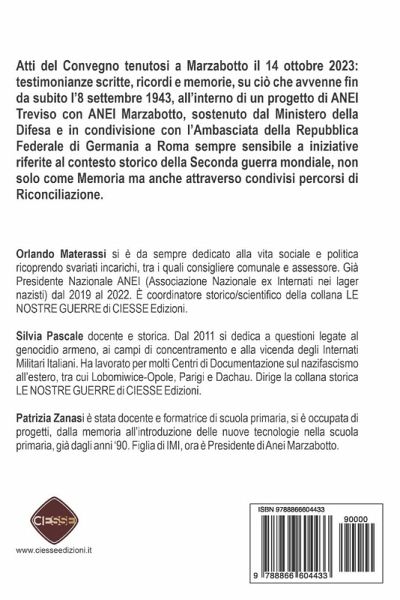 Atti del Convegno tenutosi a Marzabotto il 14 ottobre 2023: testimonianze scritte, ricordi e memorie, su ciò che avvenne fin da subito l'8 settembre 1943, all'interno di un progetto di ANEI Treviso con ANEI Marzabotto, sostenuto dal Ministero della Difesa e in condivisione con l'Ambasciata della Repubblica Federale di Germania a Roma sempre sensibile a iniziative riferite al contesto storico della Seconda guerra mondiale, non solo come Memoria ma anche attraverso condivisi percorsi di Riconciliazione. _______________ Orlando Materassi si è da sempre dedicato alla vita sociale e politica ricoprendo svariati incarichi, tra i quali consigliere comunale e assessore. Già Presidente Nazionale ANEI (Associazione Nazionale ex Internati nei lager nazisti) dal 2019 al 2022. È coordinatore storico/scientifico della collana LE NOSTRE GUERRE di Ciesse Edizioni. Silvia Pascale docente e storica. Dal 2011 si dedica a questioni legate al genocidio armeno, ai campi di concentramento e alla vicenda degli Internati Militari Italiani. Ha lavorato per molti Centri di Documentazione sul nazifascismo all'estero, tra cui Lobomiwice-Opole, Parigi e Dachau. Dirige la collana storica LE NOSTRE GUERRE di Ciesse Edizioni. Patrizia Zanasi è stata docente e formatrice di scuola primaria, si è occupata di progetti, dalla memoria all'introduzione delle nuove tecnologie nella scuola primaria, già dagli anni '90. Figlia di IMI, ora è Presidente di Anei Marzabotto.