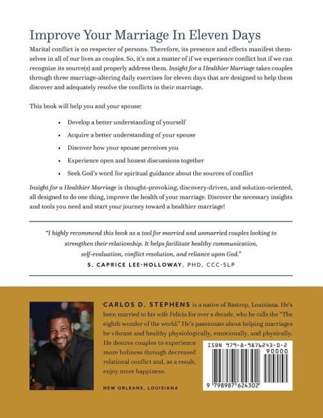 Improve Your Marriage In Eleven Days Marital conflict is no respecter of persons. Therefore, its presence and effects manifest themselves in all of our lives as couples. So, it's not a matter of if we experience conflict but if we can recognize its source(s) and properly address them. Insight for a Healthier Marriage takes couples through three marriage-altering daily exercises for eleven days that are designed to help them discover and adequately resolve the conflicts in their marriage. This book will help you and your spouse:Develop a better understanding of yourself Acquire a better understanding of your spouse Discover how your spouse perceives you Experience open and honest discussions together Seek God's word for spiritual guidance about the sources of conflict Insight for a Healthier Marriage is thought-provoking, discovery-driven, and solution-oriented, all designed to do one thing, improve the health of your marriage. Discover the necessary insights and tools you need and start your journey toward a healthier marriage! Purchase your copy today!