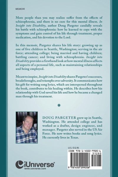 More people than you may realize suffer from the effects of schizophrenia, and there is no cure for this mental illness. In Insight into Disability, author Doug Pargeter candidly reveals his battle with schizophrenia: how he learned to cope with the symptoms and gain control of his life through treatment, proper medication, and his devotion to the Lord. In this memoir, Pargeter shares his life story: growing up as one of five children in Seattle, Washington; serving in the air force; attending college; being married and having children; battling cancer; and living with schizophrenia. Insight into Disability provides a firsthand look at how mental illness affects all aspects of a personal life, such as maintaining relationships and being employed. Meant to inspire, Insight into Disability shares Pargeter's successes, breakthroughs, and triumphs over adversity. It communicates how his gift for writing song lyrics, which are interspersed throughout the book, contributes to his healing within. He describes how his relationship with God saved his life and how he became a changed man through his treatment.