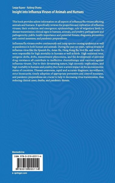 This book provides salient information on all aspects of influenza/flu viruses affecting animals and humans. It specifically reviews the properties and replication of influenza viruses; their evolution and emergence; epidemiology; role of migratory birds in disease transmission; clinical signs in humans, animals and poultry; pathogenesis and pathogenicity; public health importance and potential threats; diagnosis; prevention and control measures; and pandemic preparedness. Influenza/flu viruses evolve continuously and jump species causing epidemics as well as pandemics in both human and animals. During the past 150 years, various strains of influenza virus like the Spanish flu, Asian flu, Hong Kong flu, bird flu and swine flu were responsible for high mortality in humans as well as birds. High mutation rates, antigenic shifts, drifts, reassortment phenomena, and the development of antiviral drug resistance all contribute to ineffective chemotherapy and vaccines against influenza viruses. Due to their devastating nature, high zoonotic implications and high mortality in humans and poultry, they have a severe impact on the socioeconomic status of countries. Disease awareness, rapid and accurate diagnosis, surveillance, strict biosecurity, timely adoption of appropriate preventive and control measures and pandemic preparedness are crucial to help reduce virus transmission, thus reducing clinical cases, deaths and pandemic threats.