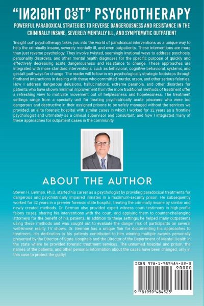 'Insight out' psychotherapy takes you into the world of paradoxical interventions as a unique way to help the criminally insane, severely mentally ill, and even outpatients. These interventions are more than just reverse psychology. They involve twisted, seemingly irrational ways to address psychosis, personality disorders, and other mental health diagnoses for the specific purpose of quickly and effectively decreasing acute dangerousness and resistance to change. The reader will follow in the author's psychologically strategic footsteps through firsthand interactions in dealing with those who committed murder, arson, and other serious felonies. How the author addresses dangerous delusions, hallucinations, extreme paranoia, and other disorders for patients who have shown minimal improvement from the more traditional methods of treatment offer a refreshing view to motivate movement out of helplessness and hopelessness. The treatment settings range from a specialty unit for treating psychiatrically acute prisoners who were too dangerous and destructive in their assigned prisons to be safely managed without the unique services provided, an elite forensic hospital with similar cases in which the author worked for 32 years as a frontline psychologist, clinical supervisor, and consultant, and how the author integrated many of these unusual approaches for outpatient cases in the community.