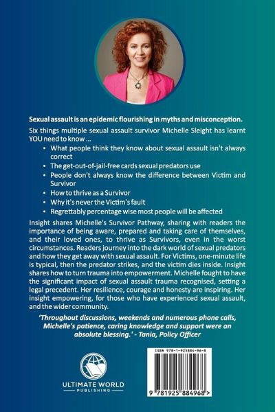 Sexual assault is an epidemic flourishing in myths and misconception. Six things multiple sexual assault survivor Michelle Sleight has learnt YOU need to know ... · What people think they know about sexual assault isn't always correct · The get-out-of-jail-free cards sexual predators use · People don't always know the difference between Victim and Survivor · How to thrive as a Survivor · Why it's never the Victim's fault · What you need to know to address the rape culture cycle Insight educates readers to be aware, be prepared and in the worst circumstances, how to take care of themselves and thrive as Survivors. Readers journey into the dark world of sexual predators and how they get away with sexual assault. For Victims, one minute life is typical, then the predator strikes and the victim dies inside. Michelle shares how she turned trauma into empowerment. Insightshares her life of never giving up, and her skills and courage to find her way out of the Victim cycle. Michelle fought to have the significant impact of sexual assault trauma recognised, setting a legal precedent. Her resilience, courage and honesty are inspiring. Her insight empowering, for those who have experienced sexual assault, and the wider community. 'Throughout discussions, weekends and numerous phone calls, Michelle's patience, caring knowledge and support were an absolute blessing.' - Tania, Policy Officer