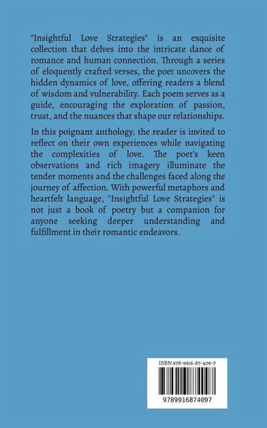 "Insightful Love Strategies" is an exquisite collection that delves into the intricate dance of romance and human connection. Through a series of eloquently crafted verses, the poet uncovers the hidden dynamics of love, offering readers a blend of wisdom and vulnerability. Each poem serves as a guide, encouraging the exploration of passion, trust, and the nuances that shape our relationships. In this poignant anthology, the reader is invited to reflect on their own experiences while navigating the complexities of love. The poet's keen observations and rich imagery illuminate the tender moments and the challenges faced along the journey of affection. With powerful metaphors and heartfelt language, "Insightful Love Strategies" is not just a book of poetry but a companion for anyone seeking deeper understanding and fulfillment in their romantic endeavors.