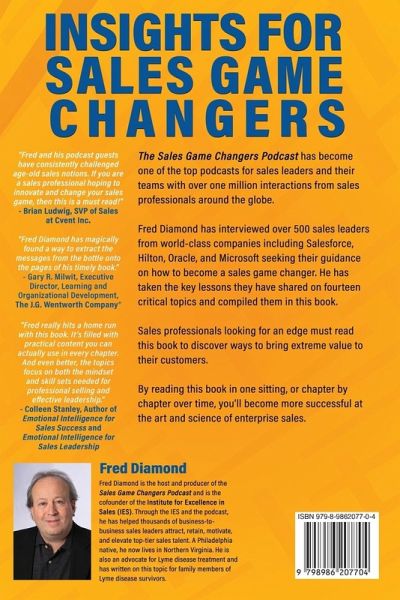 Insights for Sales Game Changers gives experienced and new to sales professionals insights from the top sales leaders on the planet on how to grow revenue, develop deeper customer relationships, and grow your sales career. Whether you've been selling for decades or are new to the field, you'll benefit from this book! Based on his over 500 interviews on the award-winning Sales Game Changers Podcast, Institute for Excellence in Sales cofounder Fred Diamond finds the best tips, ideas, and recommendations for you to think about, apply, and develop to grow your sales career. As Fred likes to say, sales is a profession and if you're going to succeed, you need to be a professional. Learn from sales leaders at companies such as Salesforce, Oracle, Amazon Web Services, Hilton, and many others about how to grow your sales career during challenging times. The book goes deep into how you can develop the proper skills to move your career forward: You'll learn:Leadership for Sales Success Account Planning: Your Future Self Will Thank You Conversations that Create Relationships Urgency: How to Create Truthful, Compelling Reasons to Act Succeeding in Sales with Emotional Intelligence Powerful Mindsets Improve Profitability Prospecting Secrets from the Pros Insights for Sales Game Changers is filled with fresh ideas that you must implement to have success in business to business, complex, and enterprise sales. In one of the most inspiring and thoughtful books written on sales, Fred Diamond takes you to a level most sales professionals can only dream of reaching. Read this book. Study this book. Become a richer, more innovative, and successful sales professional now!