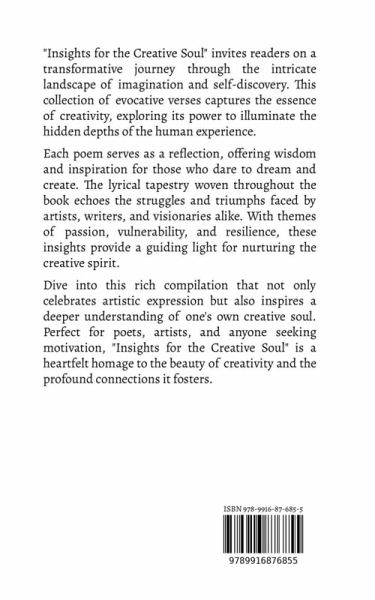"Insights for the Creative Soul" invites readers on a transformative journey through the intricate landscape of imagination and self-discovery. This collection of evocative verses captures the essence of creativity, exploring its power to illuminate the hidden depths of the human experience. Each poem serves as a reflection, offering wisdom and inspiration for those who dare to dream and create. The lyrical tapestry woven throughout the book echoes the struggles and triumphs faced by artists, writers, and visionaries alike. With themes of passion, vulnerability, and resilience, these insights provide a guiding light for nurturing the creative spirit. Dive into this rich compilation that not only celebrates artistic expression but also inspires a deeper understanding of one's own creative soul. Perfect for poets, artists, and anyone seeking motivation, "Insights for the Creative Soul" is a heartfelt homage to the beauty of creativity and the profound connections it fosters.