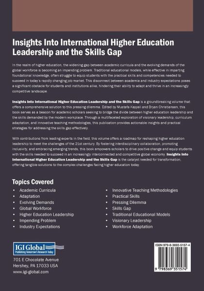 In the realm of higher education, the widening gap between academic curricula and the evolving demands of the global workforce is becoming an impending problem. Traditional educational models, while effective in imparting foundational knowledge, often struggle to equip students with the practical skills and competencies needed to succeed in today's rapidly changing job market. This disconnect between academia and industry expectations poses a significant obstacle for students and institutions alike, hindering their ability to adapt and thrive in an increasingly competitive landscape. Insights Into International Higher Education Leadership and the Skills Gap is a groundbreaking volume that offers a comprehensive solution to this pressing dilemma. Edited by Mustafa Kayyali and Bryan Christiansen, this book serves as a beacon for academic scholars seeking to bridge the divide between higher education leadership and the skills demanded by the modern workplace. Through a multifaceted exploration of visionary leadership, curriculum adaptation, and innovative teaching methodologies, this publication provides actionable insights and practical strategies for addressing the skills gap effectively.