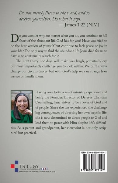 Do not merely listen to the word, and so deceive yourselves. Do what it says. - James 1:22 (NIV) Do you wonder why, no matter what you do, you continue to fall short of the abundant life God has for you? Have you tried to be the best version of yourself but continue to lack peace or joy in your life? The only way to find the abundant life Jesus died for us to have is to continually search for it. The next thirty-one days will make you laugh, potentially cry, but most importantly challenge you to look within. We can't always change our circumstances, but with God's help we can change how we see or handle them.