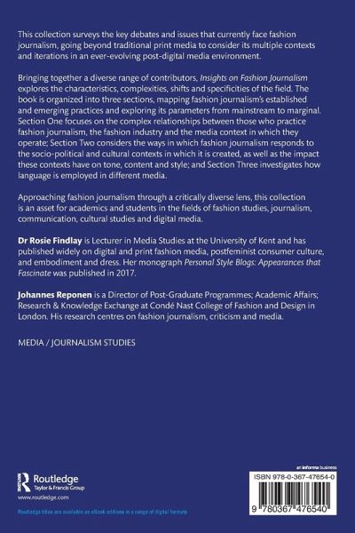 Bringing together a diverse range of contributors, Insights on Fashion Journalism explores the characteristics, complexities, shifts and specificities of the field. The book is organized into three sections, mapping fashion journalism's established and emerging practices and exploring its parameters from mainstream to marginal. Section One focuses on the complex relationships between those who practice fashion journalism, the fashion industry and the media context in which they operate; Section Two considers the ways in which fashion journalism responds to the socio-political and cultural contexts in which it is created, as well as the impact these contexts have on tone, content and style; and Section Three investigates how language isemployed in different media.