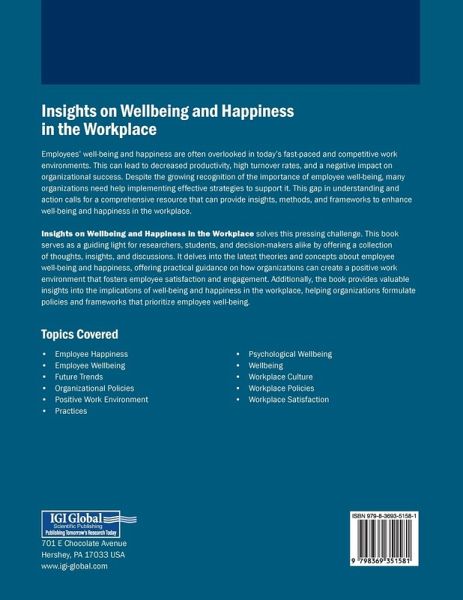 Employees' well-being and happiness are often overlooked in today's fast-paced and competitive work environments. This can lead to decreased productivity, high turnover rates, and a negative impact on organizational success. Despite the growing recognition of the importance of employee well-being, many organizations need help implementing effective strategies to support it. This gap in understanding and action calls for a comprehensive resource that can provide insights, methods, and frameworks to enhance well-being and happiness in the workplace. Insights on Wellbeing and Happiness in the Workplace solves this pressing challenge. This book serves as a guiding light for researchers, students, and decision-makers alike by offering a collection of thoughts, insights, and discussions. It delves into the latest theories and concepts about employee well-being and happiness, offering practical guidance on how organizations can create a positive work environment that fosters employee satisfaction and engagement. Additionally, the book provides valuable insights into the implications of well-being and happiness in the workplace, helping organizations formulate policies and frameworks that prioritize employee well-being.