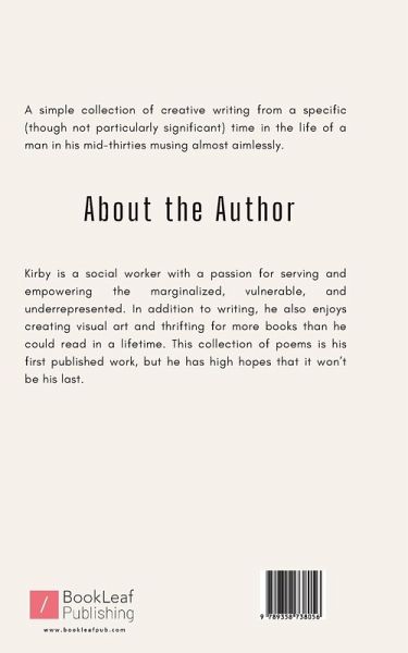 Kirby Peterson is a social worker with a passion for serving and empowering marginalized, vulnerable, minoritized, and underrepresented populations. In addition to experimenting with creative writing, Kirby also enjoys creating visual art and thrifting for more books than he could read in a lifetime. If you enjoy this book, consider checking out his previous work, Insignificant Time Capsule.
