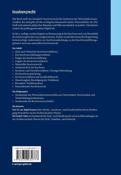 Ziele und Verlauf des Insolvenzverfahrens.- Das Insolvenzeröffnungsverfahren.- Folgen der Insolvenzeröffnung.- Organe des Insolvenzverfahrens.- Materielles Insolvenzrecht.- Arbeitsrecht in der Insolvenz.- Insolvenz und Gerichtsverfahren / Zwangsvollstreckung.- Die Insolvenzanfechtung.- Insolvenzverfahren und Gesellschaftsrecht.- Masselosigkeit, Beendigung des Verfahrens.- Besondere Verfahrensarten.- Internationales Insolvenzrecht.