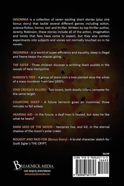 INSOMNIA is a collection of seven exciting short stories (plus one bonus story) that tackle several different genres including action, science-fiction, horror, noir and thriller. Written by top thriller author, Jeremy Robinson, these stories include all of the action, imagination and twists that fans have come to expect, but they also contain experiments into subjects and voices not normally touched on in his novels. INSOMNIA - In a world of super efficiency and equality, sleep is illegal and Feene keeps the masses going. THE EATER - Three children discover a writhing black puddle in the woods of New Hampshire. HARDEN'S TREE - A group of teens visit a tree planted atop the ashes of a mass murderer from late 1800's. STAR CROSSED KILLERS - Two lovers, both deadly killers, compete for the same target. COUNTING SHEEP - A future terrorist gives an insomniac three minutes to fall asleep. HEARING AID - In the future, a deaf man is healed, but does he like what he hears? DARK SEED OF THE MOON - Vampires live, and kill, in the eternal shadow of the moon's polar crater. BOUGHT AND PAID FOR (Bonus Story) - A brutal character sketch for Scott Sigler's THE CRYPT.