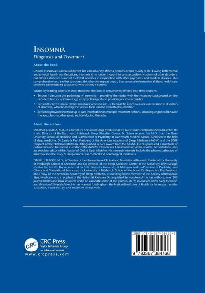 The first source on insomnia treatment since the advancement of newer drug options and cognitive behavioral therapies, Insomnia: Diagnosis and Treatment presents a comprehensive reference on the complications, evaluation, and treatment of insomnia. Ideal for sleep medicine specialists, psychiatrists, and neurologists, this text uses a multi-disciplinary approach to discuss the essential information on assessment and treatment, while also covering the science of insomnia, including the definitions, origins, and complications of the condition.