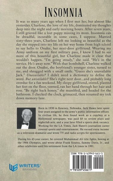 Book synopsis: It was so many years ago when I first met her, but almost like yesterday. Charlene, the love of my life, dominated my thoughts deep into the night and early morning hours. After seven years, I still grieved like a lost puppy missing its mom. Insomnia can be dreadful, and incurable in some cases, I suppose. Married sixty-three years, Charlene left me looking as beautiful as the day she stepped into my life on her way home from high school to say hello to Onalee, her next-door girlfriend. Wearing my Army uniform on my first military pass, I knew I had to see more of this beautiful girl, but Charlene made it clear that wouldn't happen. "I'm going steady," she said. "He's in the service. He's away now." With that bombshell, Charlene walked out the door. Onalee, the boyfriend's younger sister, turned to me and shrugged with a small smile. "Guess she's unavailable, Jack." Unavailable? I didn't need a dictionary to define the word. But unavailable? She's right next door... and probably long overdue for a fun weekend. My sleepy girlfriend, stirred, planted her feet on the floor, yawned, ran her hand through her hair and rose. "Be right back, honey," she mumbled and headed for the bathroom. I checked the clock, grimaced, then resumed my trek down memory lane. Autobiography: Born in 1930 in Kearney, Nebraska, Jack Hawn later spent four years assigned to the army's public information offices. In civilian life, he then found work as a copyboy at a Hollywood newspaper, was paid $5 to review plays and nightclub acts, and a year later filled a sports desk vacancy. Working for the LA Times, Jack Hawn's journalism career covered sports and entertainment. He earned extra income as a television dramatist and wrote TV and radio scripts for sportscasters.During his 43-year career, he covered Muhammad Ali title fights, boxing at the 1984 Olympics, and wrote about Frank Sinatra, Sammy Davis, Jr., and other celebrities until his retirement from the LA Times in 1991.