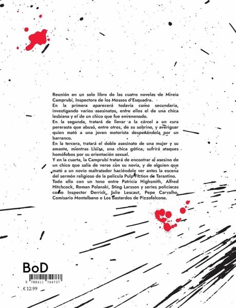 Reunión en un solo libro de las cuatro novelas de Mireia Camprubí, Inspectora de los Mossos d'Esquadra. En la primera aparecerá todavía como secundaria, investigando varios asesinatos, entre ellos el de una chica lesbiana y el de un chico que fue envenenado. En la segunda, tratará de llevar a la cárcel a un cura pererasta que abusó, entre otros, de su sobrino, y averiguar quien mató a una joven motorista despeñándola por un barranco. En la tercera, tratará el doble asesinato de una mujer y su amante, mientras Lluïsa, una chica gótica, sufrirá ataques homófobos por su orientación sexual. Y en la cuarta, la Camprubí tratará de encontrar al asesino de un chico que salía de verse con su novia, y de alguien que mató a un novio maltratador haciéndole ver antes la escena del sermón religioso de la película Pulp Fiction de Tarantino. Todo ello con un tono entre Patricia Highsmith, Alfred Hitchcock, Roman Polanski, Stieg Larsson y series policíacas como Inspector Derrick, Julie Lescaut, Pepe Carvalho, Comisario Montalbano o Los bastardos de Pizzofalcone.
