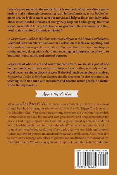 Every day, we awaken to the wonderful, rich aroma of coffee, providing a gentle push to make it through the morning rush. In the afternoon, as our bodies begin to tire, we look to tea to calm our nerves and help us finish our daily tasks. Those much-needed infusions of energy help keep our bodies going. But what about our minds? Our spirits? How do we give them the encouragement they need to stay inspired, focused, and joyful? In Inspiration Coffee & Wisdom Tea: Daily Delight at the Divine Coffeehouse, Reverend Peter Vu offers his answer in a collection of inclusive, uplifting, and wisdom-filled messages. For each day of the year, there are two thought-provoking quotes, along with a short and encouraging interpretation of each, to boost our mood, mirth, and sense of purpose. Regardless of who we are and where we come from, we are all a part of one human family, and if we can learn to help out each other, not only will our world become a kinder place, but we will also feel much better about ourselves. Inspiration Coffee & Wisdom Tea provides the blueprint for that reconnection, teaching us to fine-tune our characters and become better people-no matter where the day takes us.