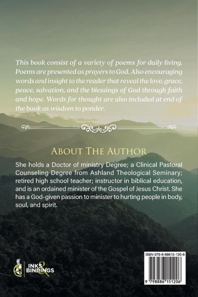 This book consist of a variety of poems for daily living. Poems are presented as prayers to God. Also encouraging words and insight to the reader that reveal the love, grace, peace, salvation, and the blessings of God through faith and hope. Words for thought are also included at end of the book as wisdom to ponder.