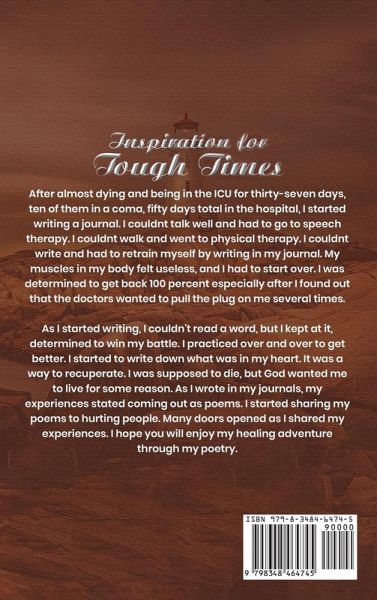 After almost dying and being in ICU for 37 days, 10 of them in a coma, 50 days total in the hospital, I started writing a journal. I couldnt talk well and had to go to speech therapy. I couldnt walk and went to physical therapy. I couldnt write and had to re-train myself by writing in my journal. My muscles in my body felt useless and I had to start over. I was determined to get back 100% especially after I found out that the doctors wanted to pull the plug on me several times. As I started writing, I couldnt read a word, but I kept at it determined to win my battle. I practiced over and over to get better. I started to write down what was on my heart. It was a way to recuperate. I was supposed to die, but God wanted me to live for some reason. As I wrote in my journals, my experiences stated coming out as poems. I started sharing my poems to hurting people. Many doors opened as I shared my experiences. I hope you will enjoy my healing adventure through my poetry.