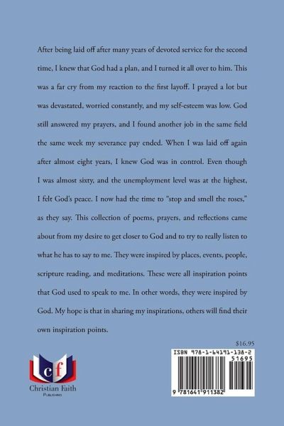 After being laid off after many years of devoted service for the second time, I knew that God had a plan, and I turned it all over to him. This was a far cry from my reaction to the first layoff. I prayed a lot but was devastated, worried constantly, and my self-esteem was low. God still answered my prayers, and I found another job in the same field the same week my severance pay ended. When I was laid off again after almost eight years, I knew God was in control. Even though I was almost sixty, and the unemployment level was at the highest, I felt Gods peace. I now had the time to stop and smell the roses, as they say. This collection of poems, prayers, and reflections came about from my desire to get closer to God and to try to really listen to what he has to say to me. They were inspired by places, events, people, scripture reading, and meditations. These were all inspiration points that God used to speak to me. In other words, they were inspired by God. My hope is that in sharing my inspirations, others will find their own inspiration points.