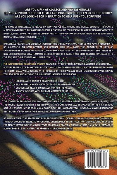 Are you a fan of college and pro basketball? Do you appreciate the creativity and passion of the players on the court? Are you looking for inspiration to help push you forward? The game of basketball is played by many people all around the world. Because it is played almost universally, the game has become a playground for creative players finding new ways to dribble, pass, score, and defend. When creativity happens on the court, there can be some quite inspirational moments born. Basketball players are uniquely talented. The speed, precision, finesse and power required to be successful on both offense and defense make it a game that provides for lots of entertainment. Players are always looking for a way to outwit their opponents, whether it be a new dribbling move or a teammate getting open for a pass. Those elite players have made it to the top, and their stories will inspire you. The Inspirational Basketball Stories for Young Readers contains 12 true stories involving amateur and basketball players from all of basketball history. You'll encounter basketball players pushing the game to its limits, all while dealing with troubles of their own, and their tenaciousness will inspire you, too. Here are a few of the highlights included in this book: ¿ LeBron James brings a championship home.¿ Bill Russell changes how defense is played forever.¿ One college team's Cinderella run for the ages.¿ Jimmy V inspires with the last moments of his life. The stories in this book will motivate and inspire basketball fans from all walks of life, like the young player shooting free throws at the playground, all the way up to the high school star. The stories in this book may also help explain how basketball stars can always push to the next plateau, even when their world is crumbling around them. No matter where the reader may be in their basketball journey, this book will bring happiness, through laughs or tears, to anyone who understands the difficulty of stepping onto the court for tipoff. It will inspire and motivate basketball players, showing them that a path forward is always possible, no matter the problems surrounding them. Grab a copy of The Inspirational Basketball Stories for Young Readers today and alley-oop it to a friend!