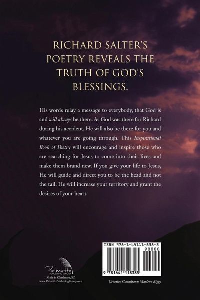 Richard Salter's poetry reveals the truth of God's blessings. His words relay a message to everybody, that God is and will always be there. As God was there for Richard during his accident, He will also be there for you and whatever you are going through. This Inspirational Book of Poetry will encourage and inspire those who are searching for Jesus to come into their lives and make them brand new. If you give your life to Jesus, He will guide and direct you to be the head and not the tail. He will increase your territory and grant the desires of your heart.