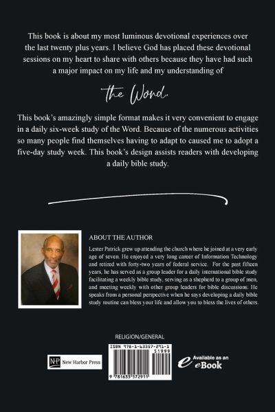 This book is about my most luminous devotional experiences over the last twenty plus years. I believe God has placed these devotional sessions on my heart to share with others because they have had such a major impact on my life and my understanding of the Word. This book's amazingly simple format makes it very convenient to engage in a daily six-week study of the Word. Because of the numerous activities so many people find themselves having to adapt to caused me to adopt a five-day study week. This book's design assists readers with developing a daily bible study.