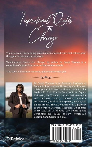 The essence of outstanding quotes offers a second voice that echoes your thoughts, beliefs, and declarations. "Inspirational Quotes For Change" by author Dr. Sarah Thomas is a collection of quotes from some of the creative minds. This book will inspire, motivate, and resonate with you.