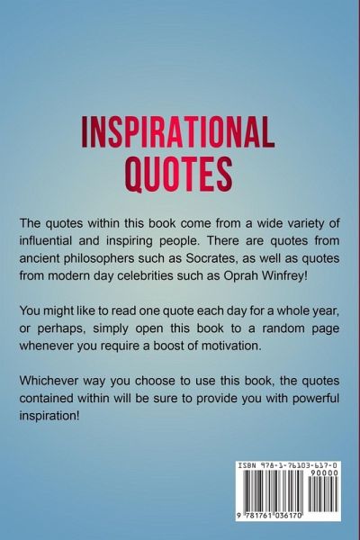 INSPIRATIONAL QUOTES ¿The quotes within this book come from a wide variety of influential and inspiring people. There are quotes from ancient philosophers such as Socrates, as well as quotes from modern day celebrities such as Oprah Winfrey! You might like to read one quote each day for a whole year, or perhaps, simply open this book to a random page whenever you require a boost of motivation. Whichever way you choose to use this book, the quotes contained within will be sure to provide you with powerful inspiration!