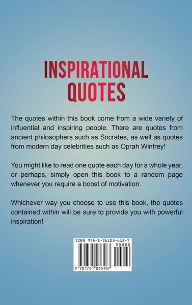 INSPIRATIONAL QUOTES ¿The quotes within this book come from a wide variety of influential and inspiring people. There are quotes from ancient philosophers such as Socrates, as well as quotes from modern day celebrities such as Oprah Winfrey! You might like to read one quote each day for a whole year, or perhaps, simply open this book to a random page whenever you require a boost of motivation. Whichever way you choose to use this book, the quotes contained within will be sure to provide you with powerful inspiration!