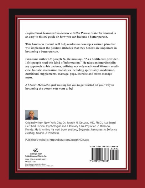 Inspirational Sentiments to Become a Better Person: A Starter Manual is an easy-to-follow guide on how you can become a better person. This hands-on manual will help readers to develop a written plan that will implement the positive attitudes that they believe are important in becoming a better person. First-time author Dr. Joseph N. DeLuca says, "As a health care provider, I felt people need this kind of information." He takes an interdisciplinary approach to his patients, utilizing not only traditional Western medicine, but also alternative modalities including spirituality, meditation, nutritional supplements, massage, yoga, exercise and stress management. A Starter Manual is just waiting for you to get started on your way to becoming the person you want to be! Originally from New York City, Dr. Joseph N. DeLuca, MD, Ph.D., is a Board Certified Clinical Psychologist and a Primary Care Physician in Orlando, Florida. He is writing his next book entitled, Snippets: Memories to Enhance Healing, Health, & Wellness. Publisher's website: http://sbpra.com/JosephNDeLuca