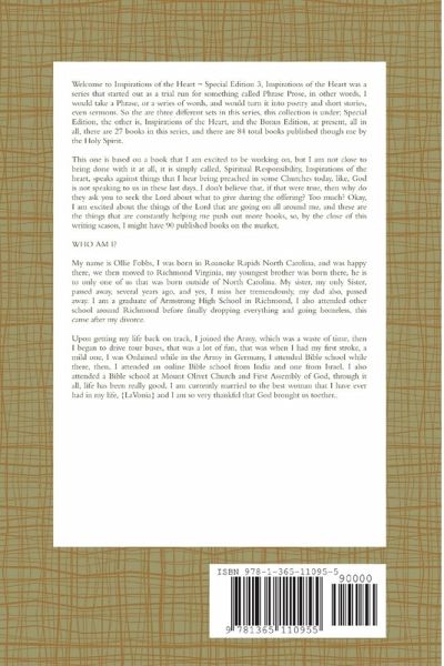Inspirations of the Heart ~ Special Edition 3, Inspirations of the Heart was a series that started out as a trial run for something called Phrase Prose, in other words, I would take a Phrase, or a series of words, and would turn it into poetry and short stories, even sermons. So the are three different sets in this series, this collection is under; Special Edition, the other is, Inspirations of the Heart, and the Bonus Edition, at present, all in all, there are 27 books in this series, and there are 21 more that are scheduled to go in Under the code of Inspirations of the Heart. I never once thought that, this series would go more than one or two books, but I am very thankful to the Lord for reveal truths that he constantly give to me to do his will in writing.