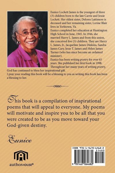 This book is a compilation of inspirational poems that will appeal to everyone. My poems will motivate and inspire you to be all that you were created to be as you move toward your God-given destiny. Eunice