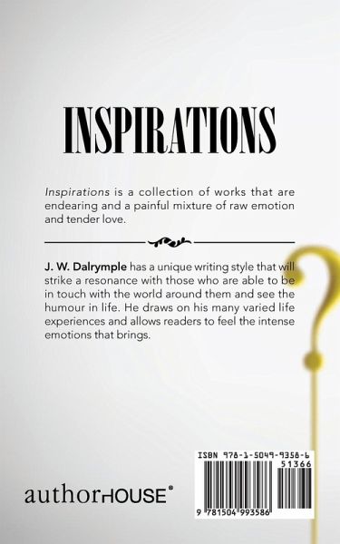J. W. Dalrymple has a unique writing style that will strike a resonance with those who are able to be in touch with the world around them and see the humour in life. He draws on his many varied life experiences and allows readers to feel the intense emotions that brings. Inspirations is J. W. Dalrymple's fourth book of poetry.