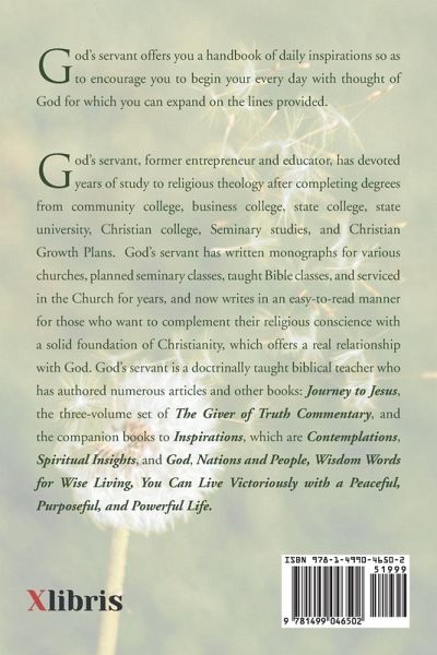 God's servant, former entrepreneur and educator, has devoted years of study to religious theology after completing degrees from community college, business college, state college, state university, Christian college, Seminary studies, and Christian Growth Plans. God's servant has written monographs for various churches, planned seminary classes, taught Bible classes, and serviced in the Church for years, and now writes in an easy-to-read manner for those who want to complement their religious conscience with a solid foundation of Christianity, which offers a real relationship with God. God's servant is a doctrinally taught biblical teacher who has authored numerous articles and other books: Journey to Jesus, the three-volume set of The Giver of Truth Commentary, and the companion books to Inspirations, which are Contemplations, Spiritual Insights, and God, Nations and People, Wisdom Words for Wise Living, You Can Live Victoriously with a Peaceful, Purposeful, and Powerful Life.