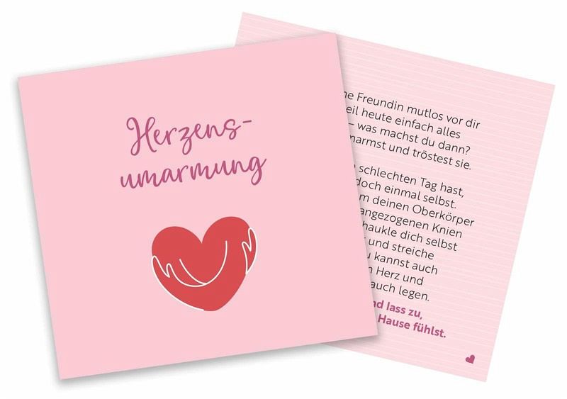 Alle Übungen sind ganz einfach und unkompliziert in den Alltag zu integrieren, denn sie dauern nur 3 Minuten. Egal, ob zu Hause oder unterwegs: Das handliche Kartenset begleitet dich überall hin und erinnert dich immer wieder daran, wie wertvoll du selbst bist.