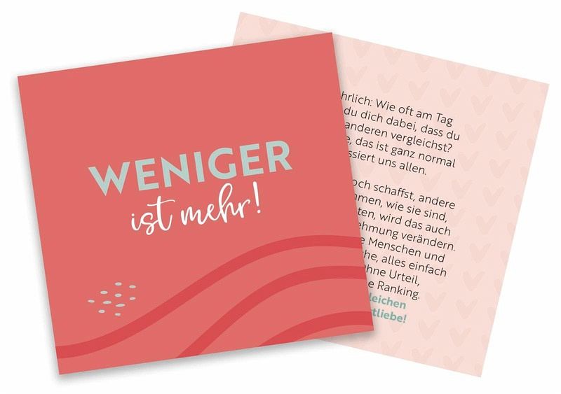 30 wunderschön gestaltete Selbstliebe-Karten in praktischer BoxAbwechslungsreiche Impulse, Denkanstöße und Übungen, die dich zu mehr Selbstakzeptanz führenWenig Zeit? Kein Problem! Jede Übung dauert nur 3 MinutenPerfektes Geschenk für sich selbst oder eine liebe Freundin