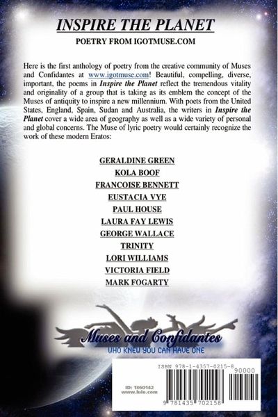 "Inspire the Planet" is an anthology of beautiful and important poetry from the Muses and Confidantes creative community at www.igotmuse.com. Poets from all over the world in its pages include GERALDINE GREEN, KOLA BOOF, FRANCOISE BENNETT, EUSTACIA VYE, P