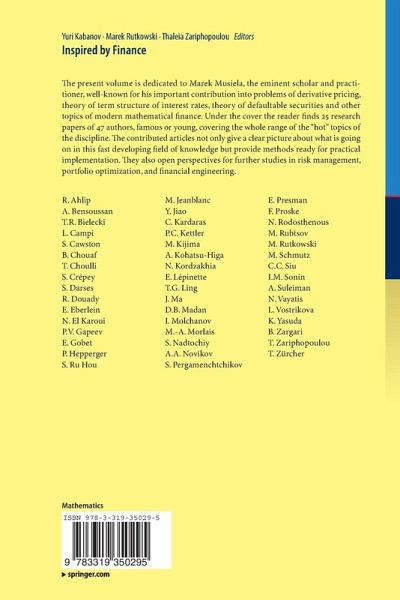 The present volume is dedicated to Marek Musiela, an eminent scholar and practitioner who is perhaps best-known for his important contributions to problems of derivative pricing, theory of term structure of interest rates, theory of defaultable securities and other topics in modern mathematical finance. It includes 25 research papers by 47 authors, established experts and newcomers alike, that cover the whole range of the "hot" topics in the discipline. The contributed articles not only give a clear picture about what is going on in this rapidly developing field of knowledge but provide methods ready for practical implementation. They also open new prospects for further studies in risk management, portfolio optimization and financial engineering.